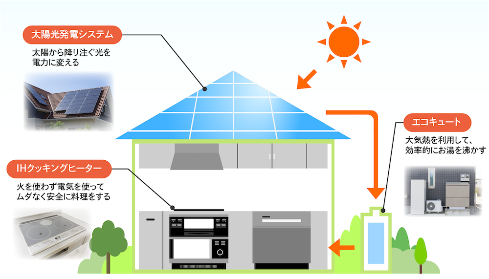 オール電化とは、家庭内で使用する熱エネルギーをすべて電気でまかなうシステムです。オール電化住宅では、キッチン、空調、給湯など、熱源は電気のみになります。