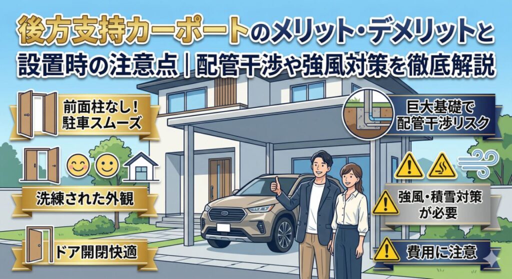 カーポートは雨天や夜間でも洗濯物を干せる便利なスペースになりますが、横からの雨の吹き込み対策や、車の動線を妨げない物干し(竿掛け)の配置が重要です。