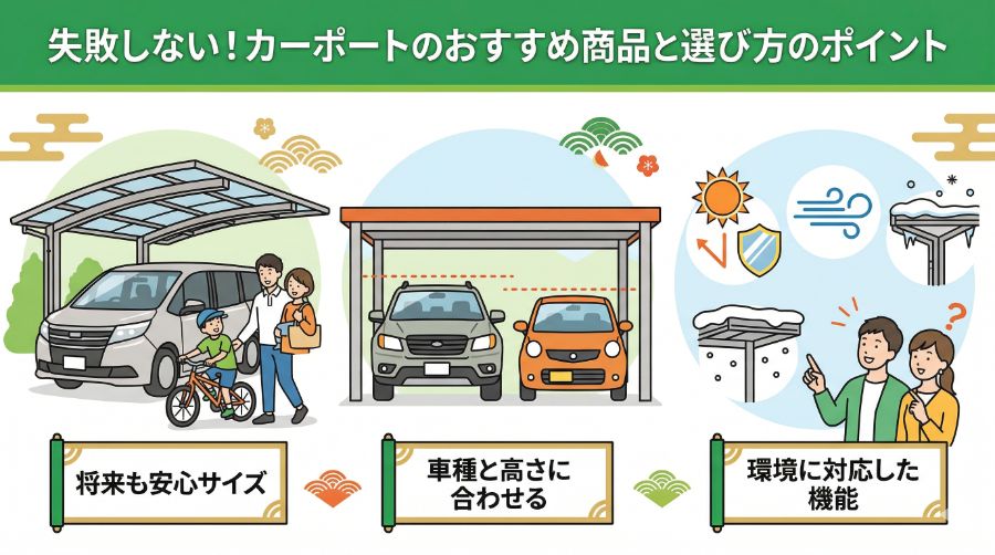 カーポート選びでは、現在だけでなく将来のライフスタイルを見据えた「サイズ選び」、敷地条件に合わせた「支柱の位置と高さ」、そして環境に応じた「機能性」の3点が重要です。