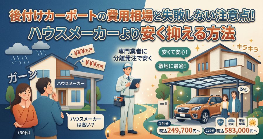 後付けカーポートの費用相場と失敗しない注意点!ハウスメーカーより安く抑える方法