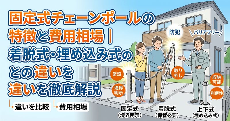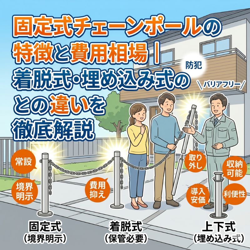 チェーンポールには主に「固定式」「着脱式」「上下式(埋め込み式)」があり、車の出し入れ頻度や見栄えの希望に合わせて選ぶことが重要です。