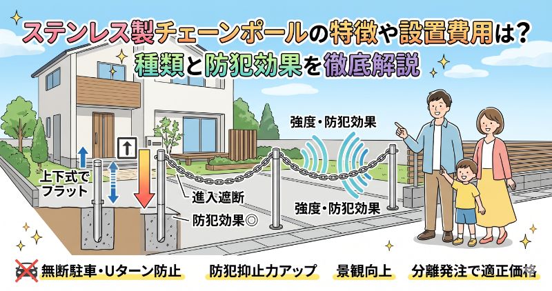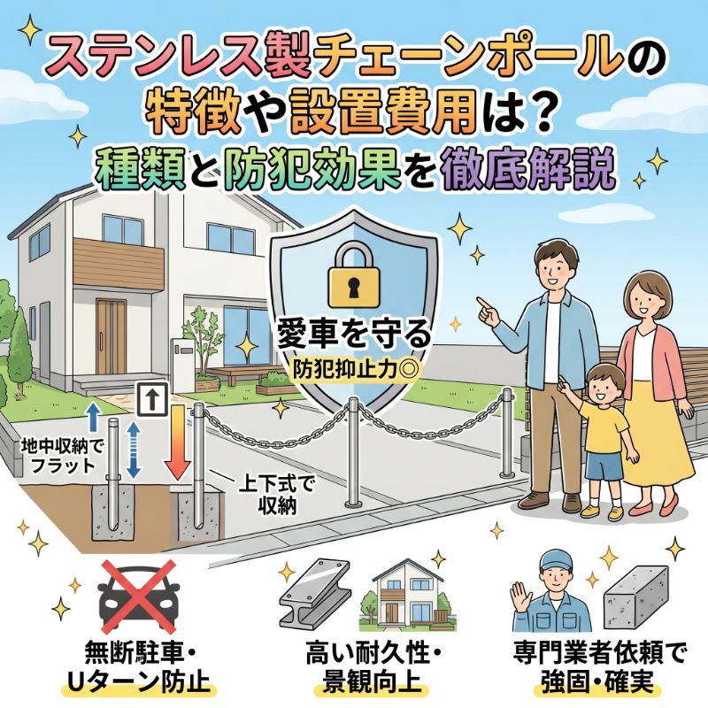 結論からお伝えすると、ステンレス製チェーンポールは高い防錆性と強度を備え、車両盗難や無断進入の防止に極めて有効です。日常の使い勝手を考慮すると、使用しない時に地中に収納できる「上下式(バリアフリー仕様)」が最もおすすめです。設置費用は、施工費やコンクリートの穴あけ・廃材処分費を含めて、3本セットで約12万円〜が目安となります。本記事では、プロの視点からチェーンポールの種類やメリット、適正な費用相場について分かりやすく解説します。