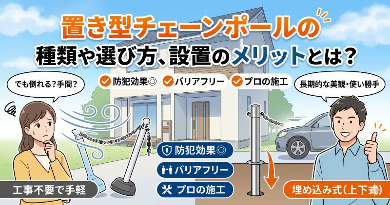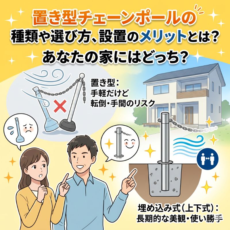 しかし、置き型には強風による転倒や毎回の出し入れの手間といった課題もあります。本記事では、置き型チェーンポールの選び方からメリット・デメリットを解説し、より快適で確実な防犯対策となる「埋め込み式(上下式)」との比較をご紹介します。結論から言えば、一時的な対策なら置き型が手軽ですが、長期的な美観と毎日の使い勝手を求めるなら埋め込み式がおすすめです。