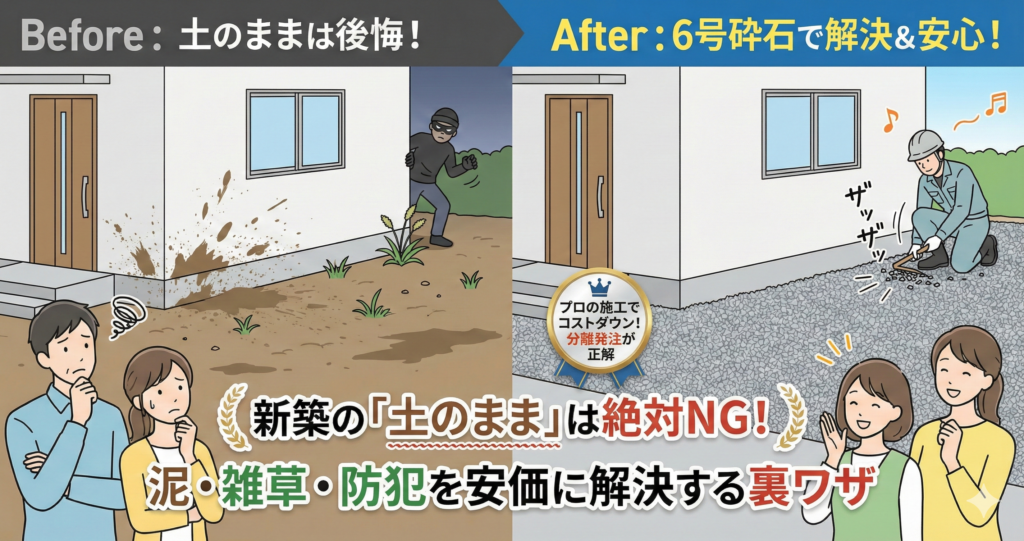 そこで賢い施主様が選んでいるのが「6号砕石(ろくごうさいせき)」による外構整備です。ハウスメーカーのオプションよりも30〜50%安く、かつプロクオリティで施工する秘訣を公開します。