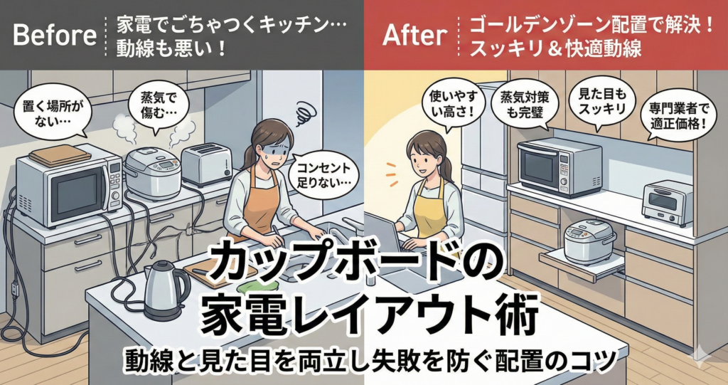 使用頻度の高い家電を「ゴールデンゾーン(腰から目線の高さ)」に配置し、炊飯器など生活感が出る家電は専用収納へ。動線を意識したゾーニングがカギです。