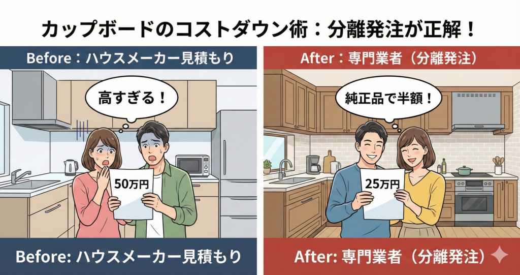 新築のキッチンに欠かせない「カップボード(食器棚)」。ハウスメーカーから提示された見積もりが40万円、50万円と予想以上に高額で、「予算オーバーだ」と頭を抱えていませんか?