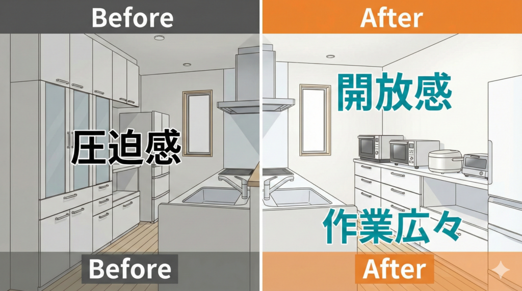 - 収納の絶対量が減る:当然ながら吊り戸棚分の収納力はなくなります。普段使わない来客用の食器やストック品の置き場所を別に考える必要があります。