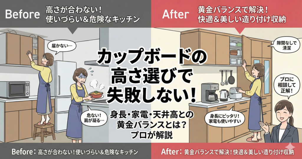 本記事では、オプション工事のプロの視点から、あなたに最適なカップボードの高さを選ぶための具体的な基準と、賢く設置する方法を解説します。