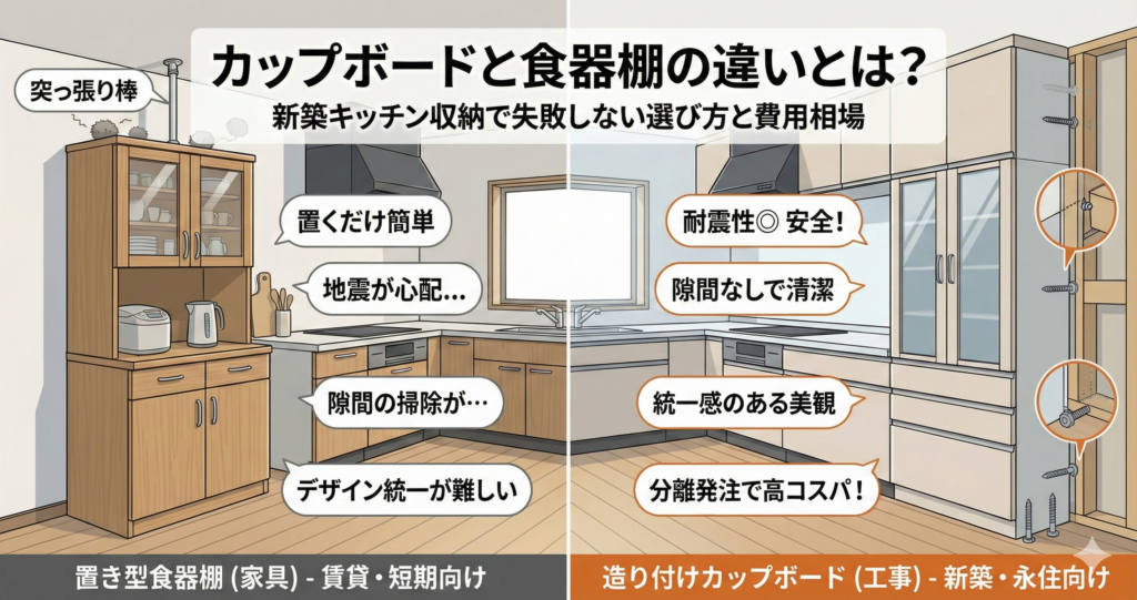 新築戸建てやマンションを購入した際、多くの人が頭を悩ませるのが「キッチンの背面収納」です。「カップボード」と「食器棚」、言葉は似ていますが、住宅業界においてはその役割や性質が大きく異なります。