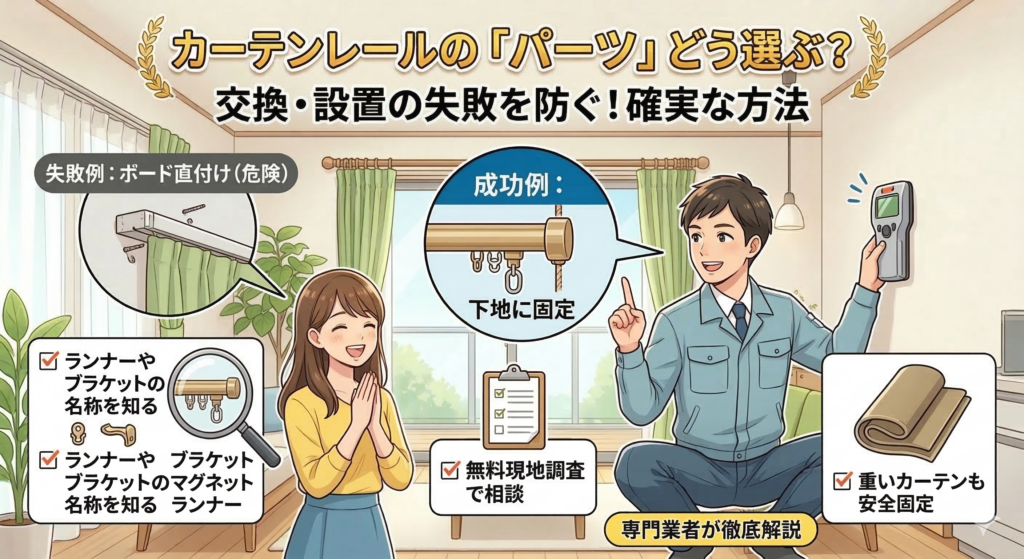 この記事では、カーテンレールの主要パーツの名称と役割、ハウスメーカー純正品と専門業者の違い、そして賢い交換・設置方法について解説します。