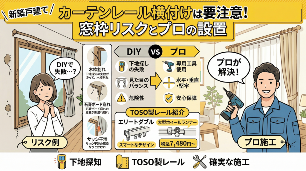 カーテンレールの「横付け」やDIY設置は、壁の強度不足や窓枠の破損といったリスクが高く、新築の大切な家を傷つけてしまう可能性があります。長く安心して使う設備だからこそ、下地のプロである専門業者にお任せください。