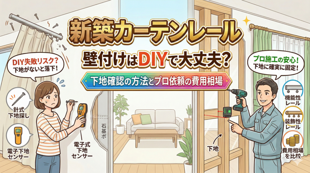 下地(木材の間柱や軽量鉄骨)がない場所にビスを打っても、カーテンの開け閉めや重みでビス穴が広がり、最悪の場合、レールごとカーテンが落下してしまいます。特に新築の場合、壁紙や壁そのものを大きく破損させるリスクがあるため、下地の確認は必須作業です。