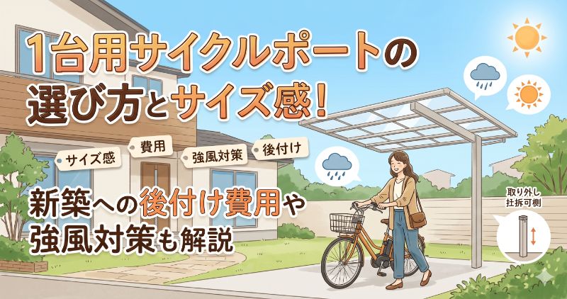 1台用のサイクルポートは、自転車のサイズに加えて雨の吹き込みを考慮し、少しゆとりのある屋根サイズを選ぶのが一般的です。強風対策や柱の位置にもこだわることで、長く快適に使用できます。