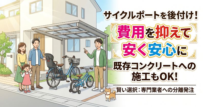 新築時に設置しなかったサイクルポートは、ハウスメーカーを通さずオプション工事専門業者に直接依頼することで、費用を大きく抑えつつ高品質な施工が可能です。