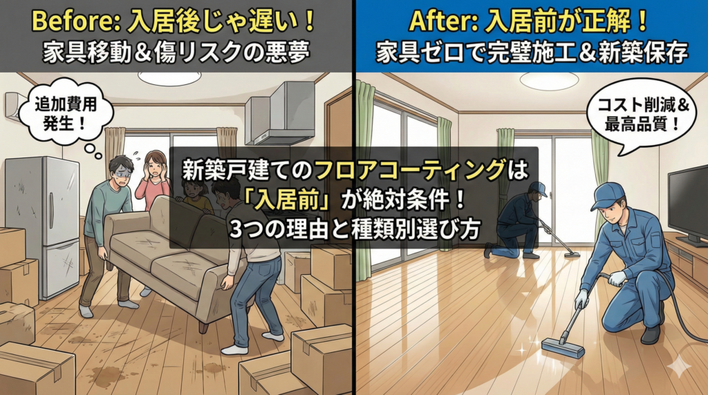 フロアコーティングを入居前に済ませるべき理由は、余計な追加費用を抑え、新築時の美しい状態を「真空パック」のように保存できるからです。また、施工に必要な乾燥期間を確保するためにも、引越し前の実施が必須条件となります。