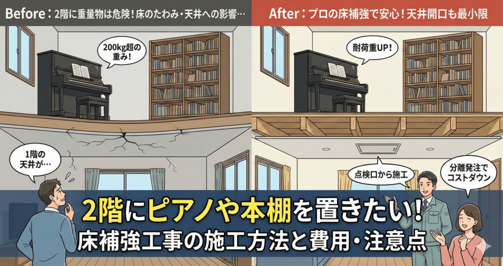この記事では、2階に重量物を置くための床補強工事について、具体的な施工の考え方や費用感、そして賢い業者の選び方を解説します。