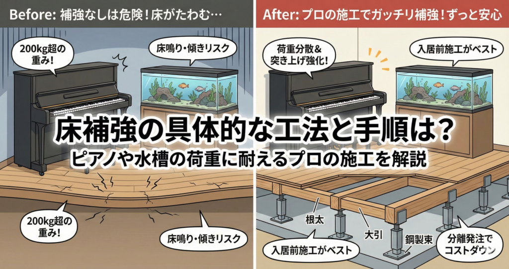 「床補強」といっても、単に床板を厚くするだけではありません。重量物の荷重に耐えるために、プロの職人は床下の構造部分に手を加えます。