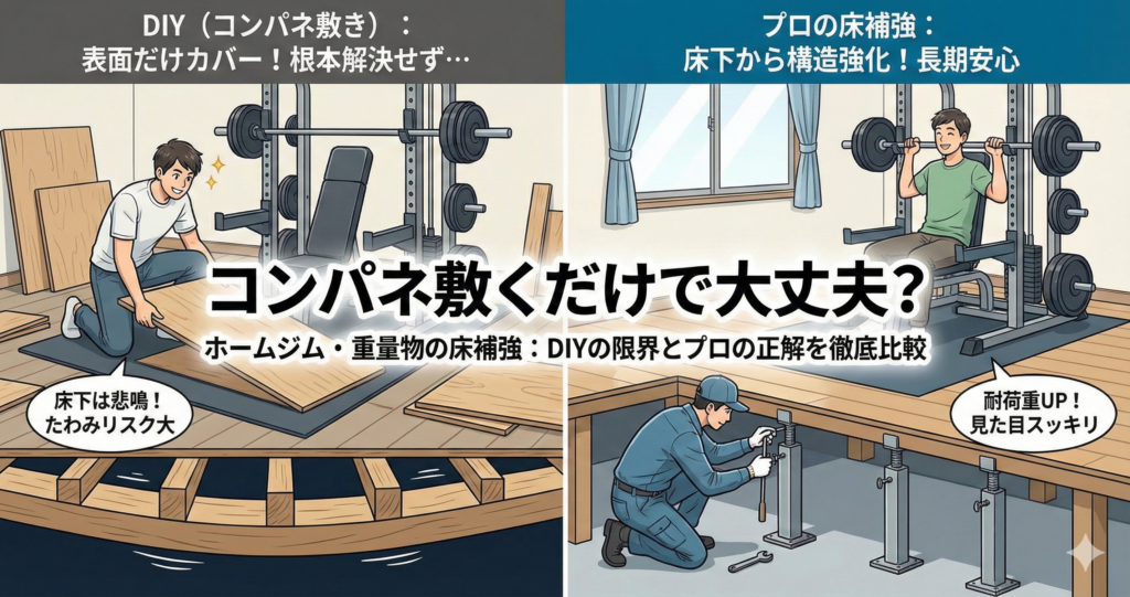 | 比較項目 | DIY(コンパネ敷き) | プロの床補強工事 (分離発注・外部業者) |