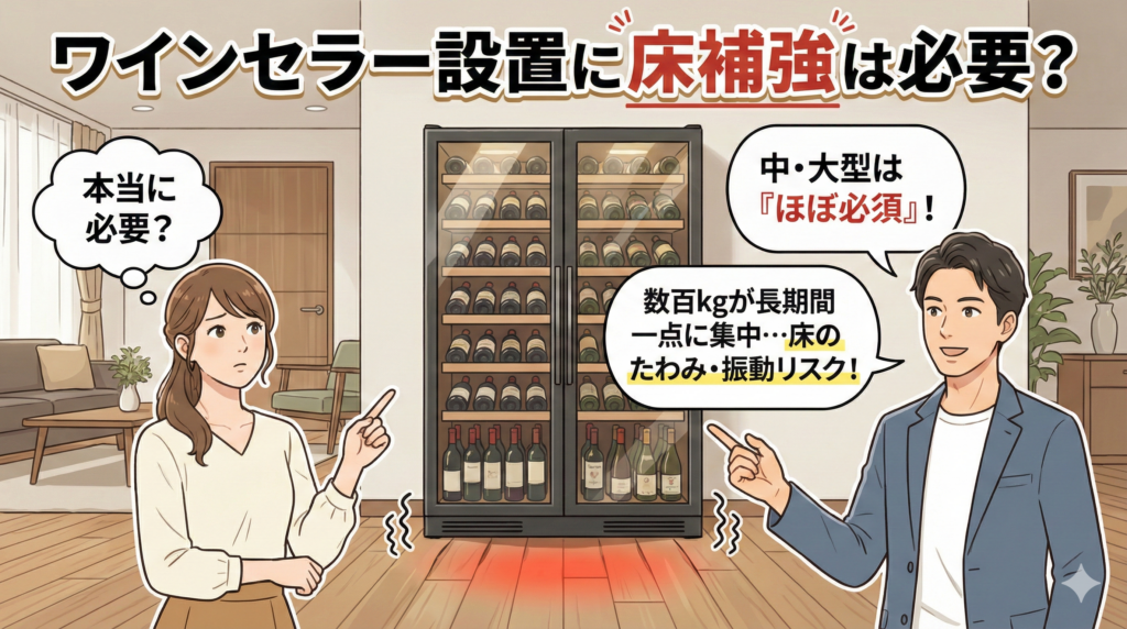 中型〜大型のワインセラーを設置する場合、床のたわみや振動を防ぐために床補強は「ほぼ必須」と言えます。