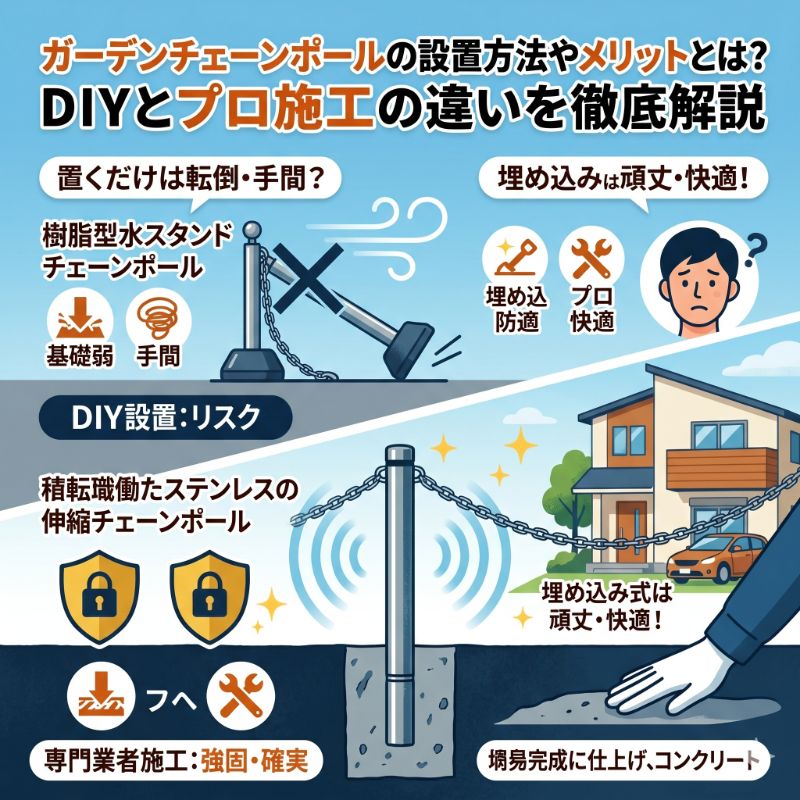 【結論】お庭や駐車スペースへの侵入防止には、景観と防犯性を両立する「埋め込み式(上下式)チェーンポール」のプロ施工が最適です