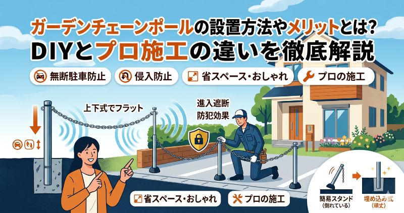 新築戸建てを購入し、開放的なオープン外構にしたものの、「知らない車が敷地内でUターンしている」「防犯面が少し心配」と悩む方は少なくありません。境界を明確にし、進入を防ぐアイテムとしてガーデンチェーンポールは非常に有効です。設置方法にはいくつか種類がありますが、毎日の生活動線や長期的な安全性を考慮すると、プロによる埋め込み式の施工が最も満足度の高い選択となります。