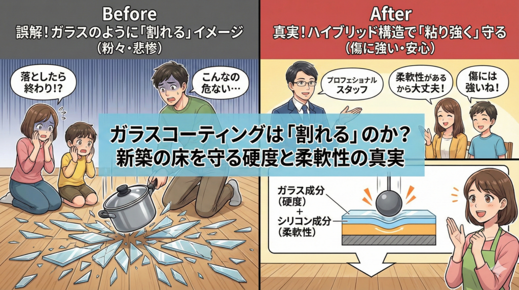 ガラスコーティングは「絶対に割れない」わけではありませんが、重い物を落とすといった事故がない限り、日常生活で割れることはまずありません。むしろ、毎日の擦り傷や汚れから20年以上にわたって床を守ってくれるメリットの方がはるかに大きいと言えます。