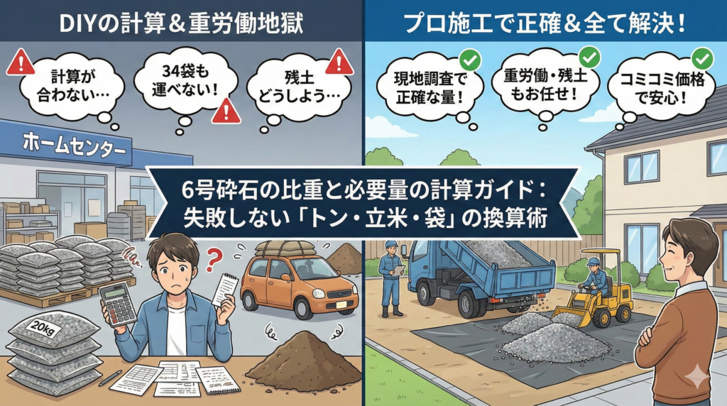 この記事では、庭のDIYで人気の「6号砕石」をテーマに、必要量の計算方法や単位の換算術をわかりやすく解説します。また、自分で運ぶ際のリスクや、プロに任せた場合のコストパフォーマンスについても比較検証します。
