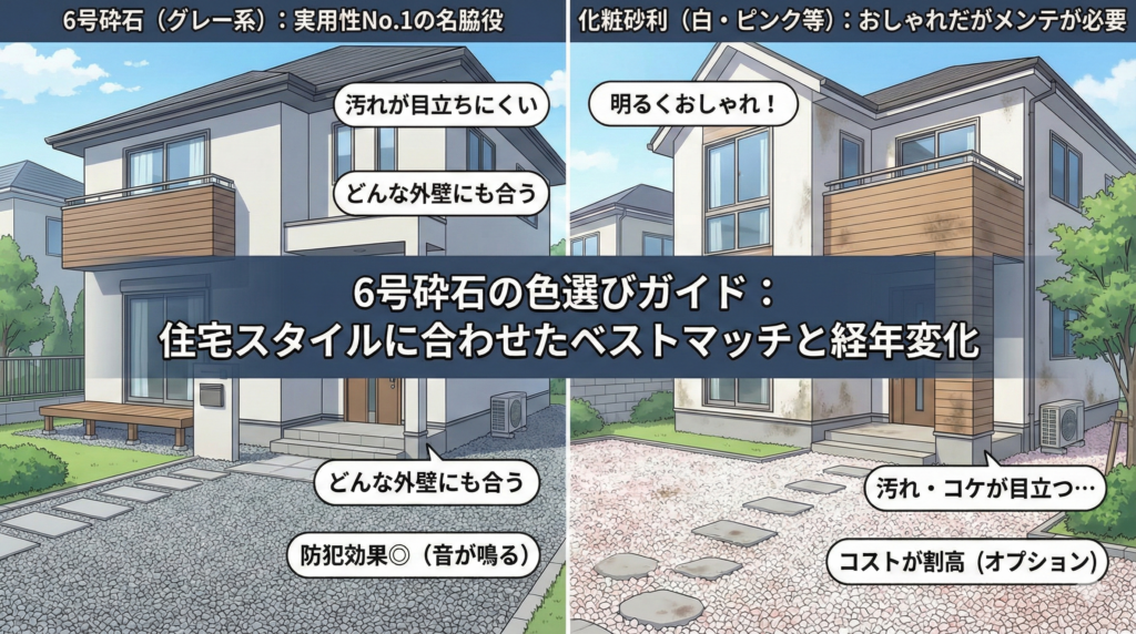 砂利は一度敷くと入れ替えが大変なため、最初の色選びが重要です。まずは「6号砕石」の基本色と、家の外観との相性を理解しましょう。