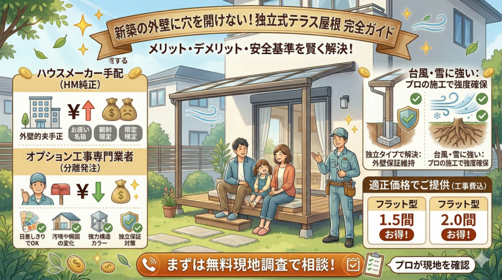 新築の外壁に穴を開けずに設置できる独立式テラス屋根は、ハウスメーカーの外壁保証・雨漏り保証を維持できるのが最大の魅力です。壁に固定しないことによる強度の不安も、基準を満たした適切な基礎工事と製品選びによって、風による倒壊リスクをしっかりと抑えることができます。