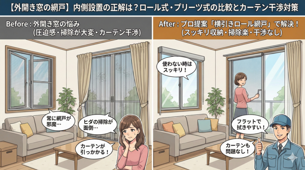 【外開き窓の網戸】内側設置の正解は?ロール式・プリーツ式の比較とカーテン干渉対策