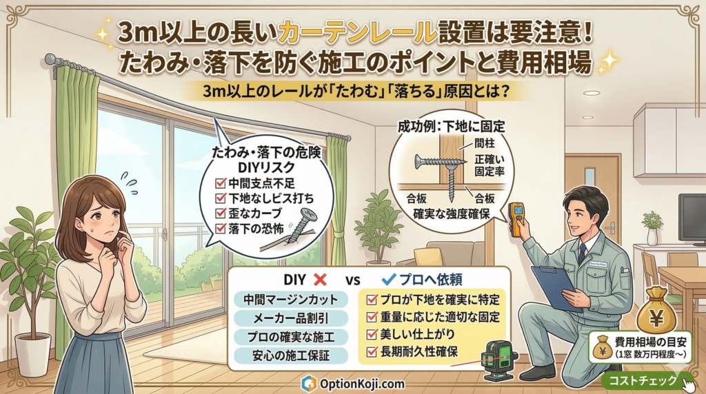 「ホームセンターで長いレールを買ってくれば安く済むのでは?」と考える方も多いですが、長尺レールの取り付けは難易度が格段に上がります。DIYとプロの施工の違いを比較しました。
