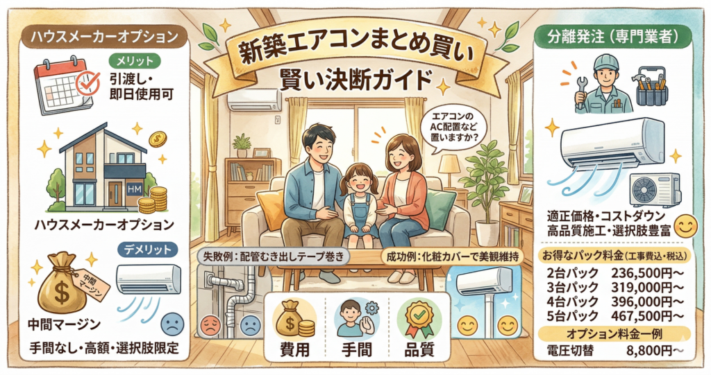 新築時のエアコンまとめ買いは、費用対効果と施工品質のバランスに優れた「オプション工事専門業者への分離発注」がおすすめです。