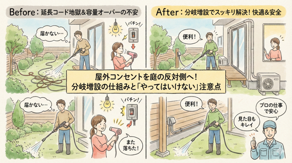 この記事では、屋外コンセントを増設する際の具体的なルート(分岐手法)と、失敗しないための「やってはいけない」注意点、そしてプロに依頼すべき理由を解説します。
