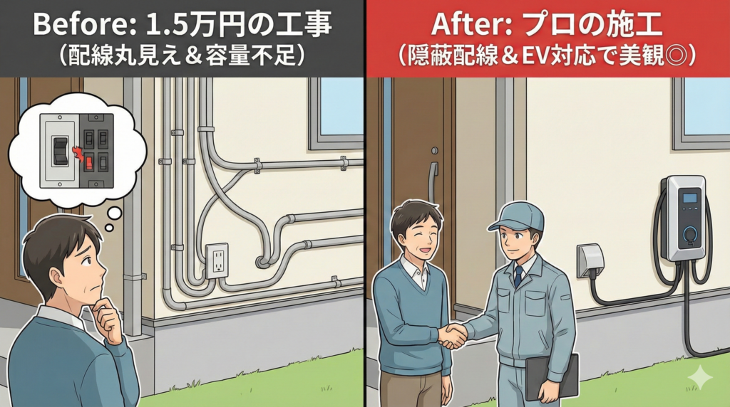「とりあえず電気が使えれば見た目は気にしない」という場合は格安工事でも問題ありませんが、新築戸建てで「外観を綺麗に保ちたい」「将来EV車を買うかもしれない」という場合は、初期費用がかかっても「しっかり施工」を選ぶ方が、結果的に満足度は高くなります。