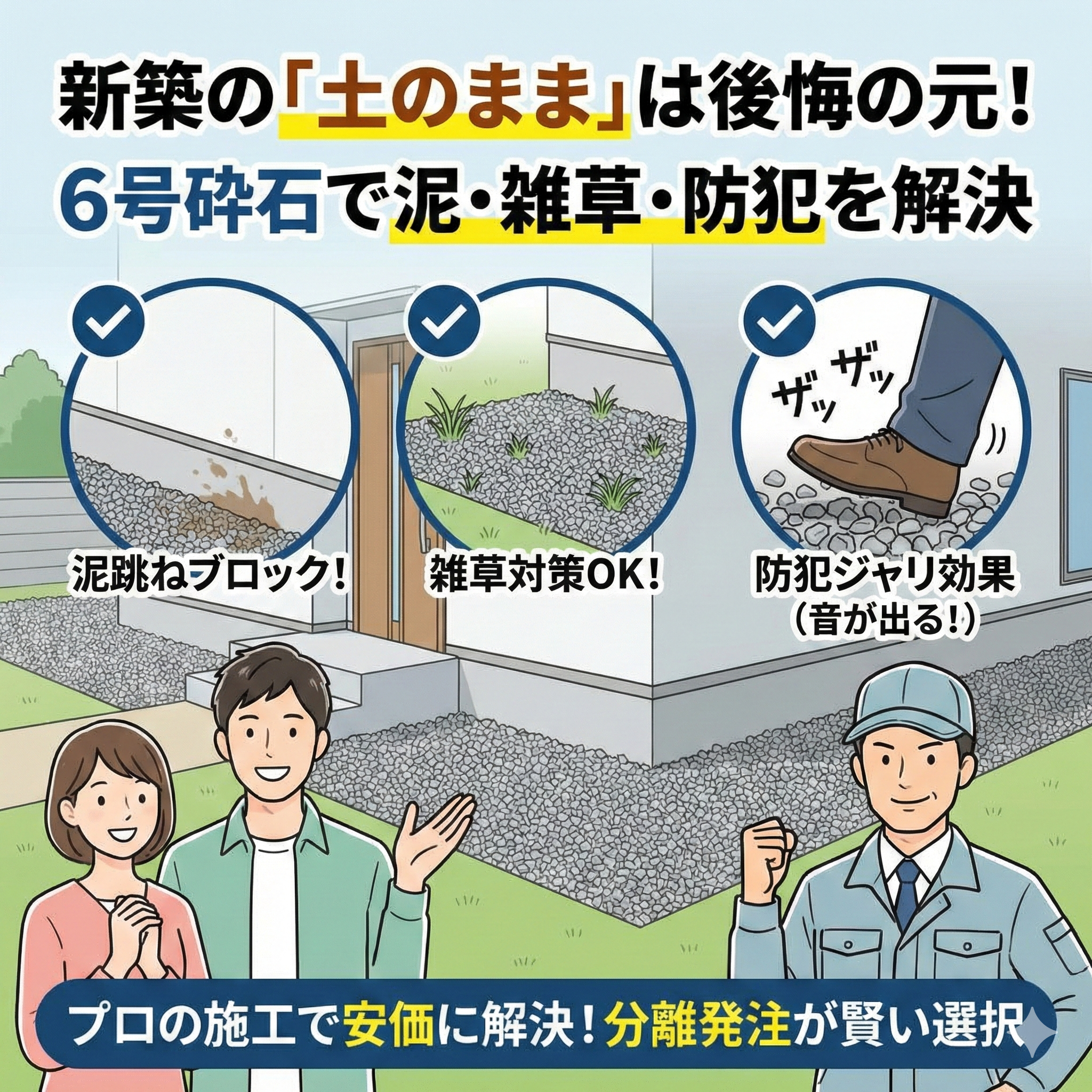 砂利工事(6号砕石)新築の「土」のままは後悔の元!6号砕石で泥・雑草・防犯を安価に解決する「裏ワザ」