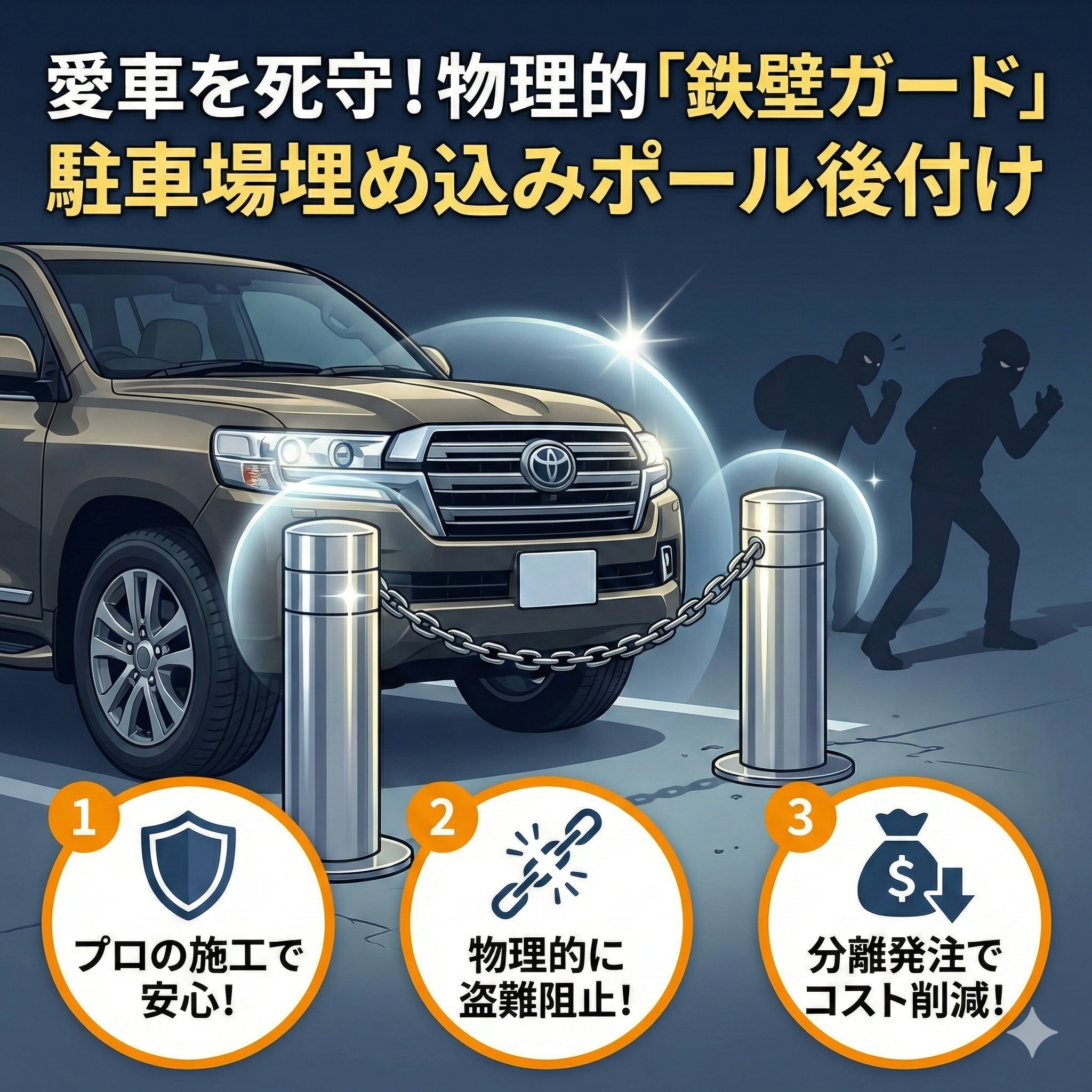 チェーンポールその対策、盗難のプロに見抜かれています。愛車を守る「駐車場埋め込みポール」後付けの正解