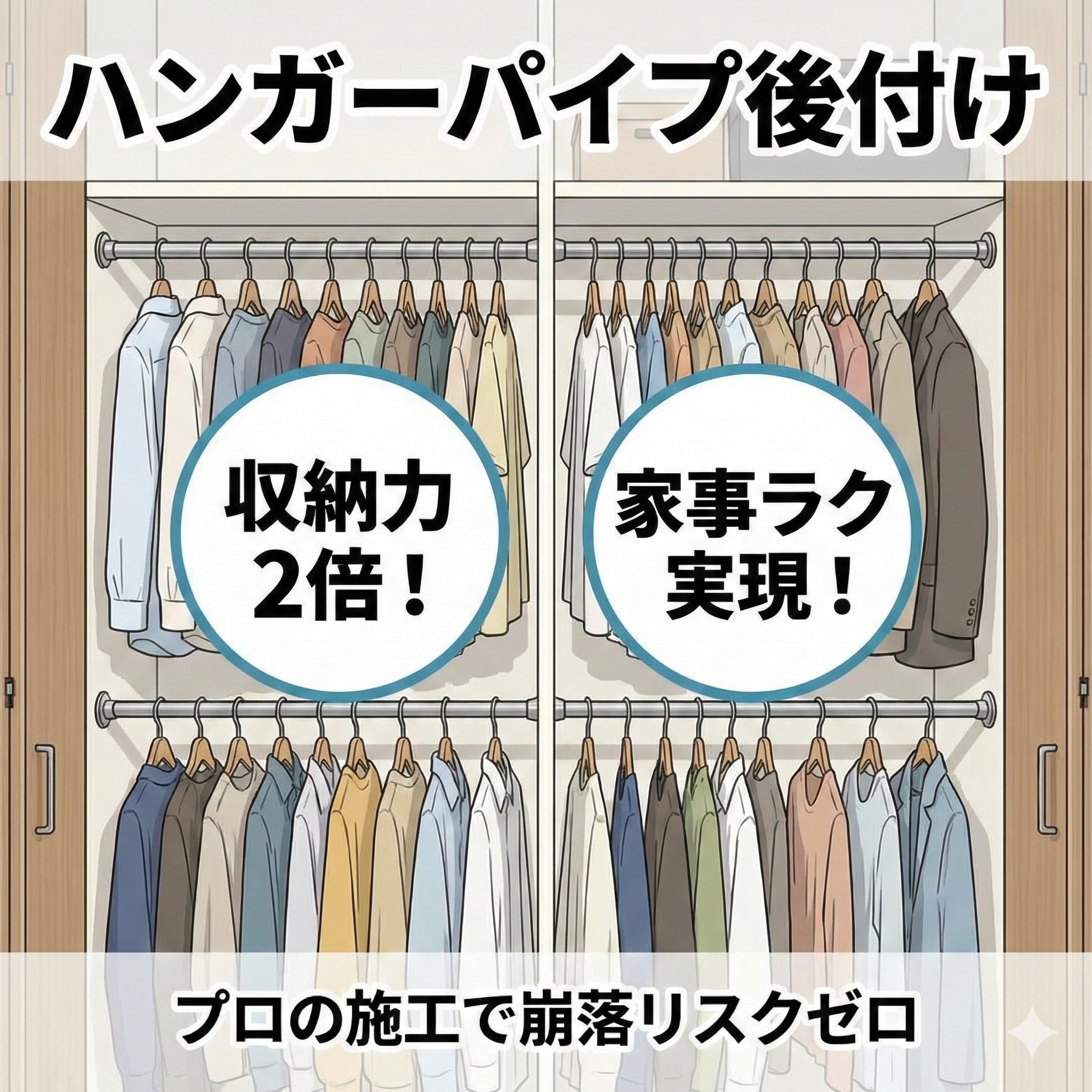ハンガーパイプクローゼットのハンガーパイプ後付けで後悔しない!収納量を2倍にし「家事ラク」を叶えるプロの秘策