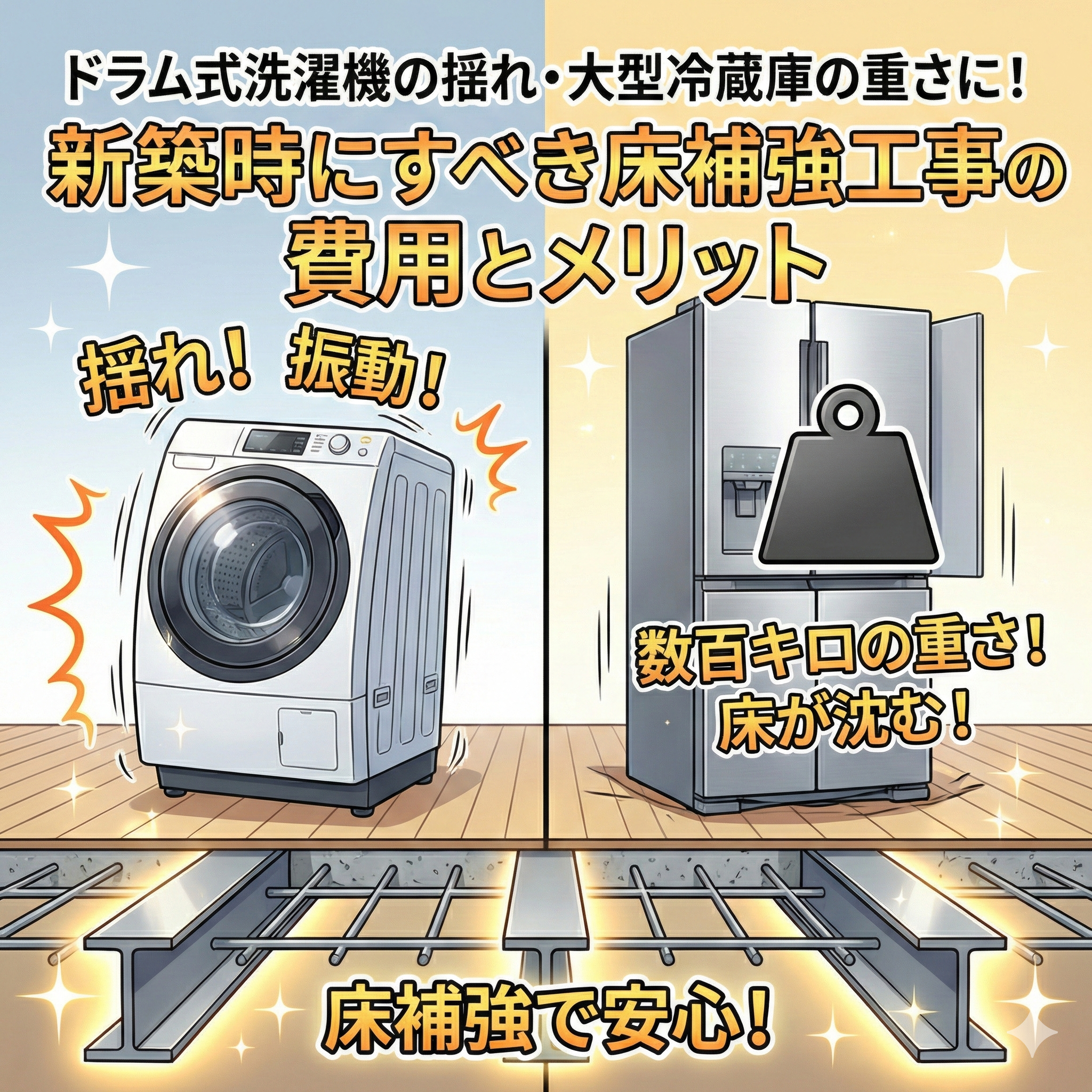 ドラム式洗濯機の揺れ・大型冷蔵庫の重さに!新築時にすべき床補強工事の費用とメリット