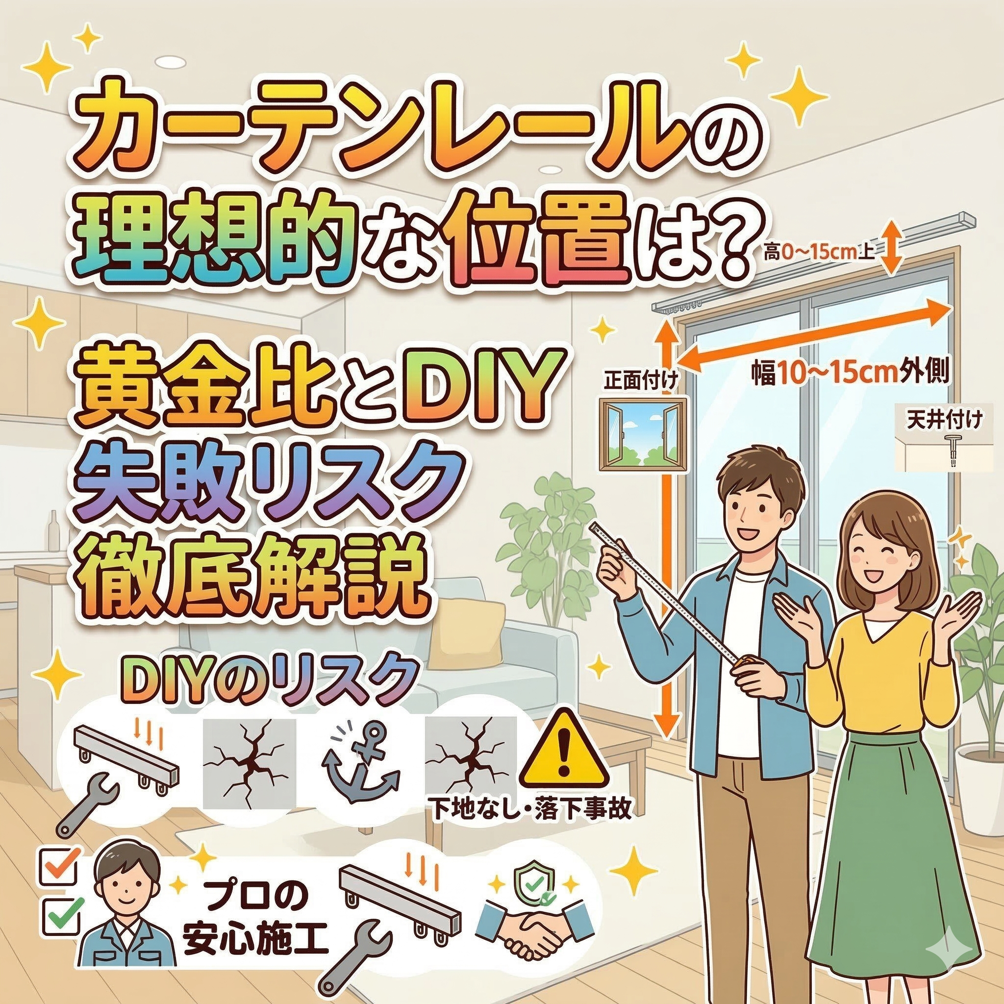 カーテンレール(機能性)カーテンレール(装飾)カーテンレールの理想的な位置は?高さ・幅の黄金比とDIYの失敗リスクを徹底解説