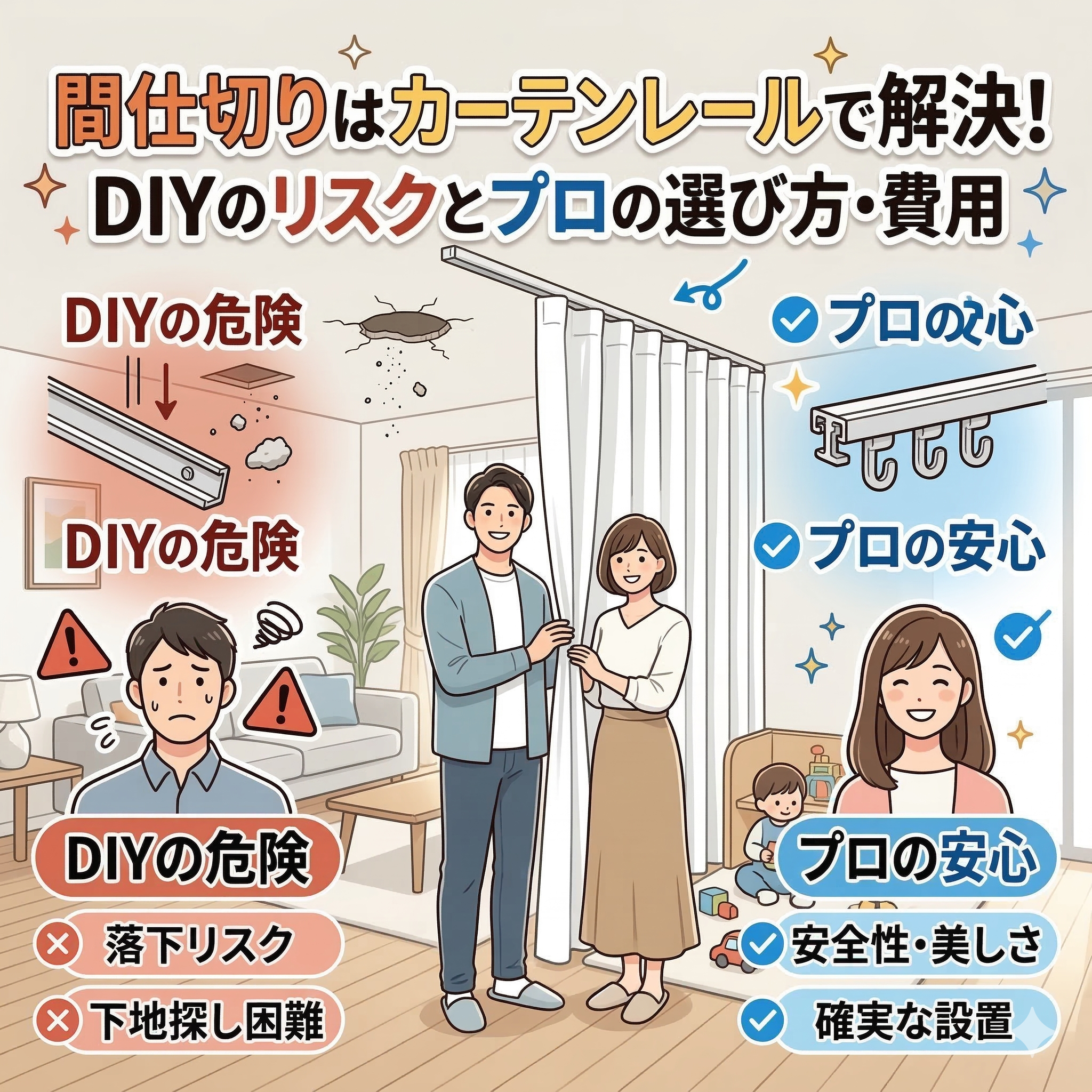 カーテンレール(機能性)カーテンレール(装飾)部屋の間仕切りはカーテンレールで解決!DIYの危険性とプロの費用・選び方