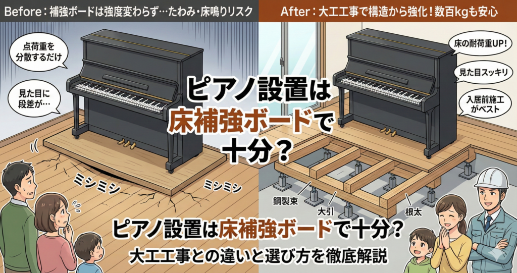 補強ボードは「凹み防止・荷重分散」が目的であり、床の強度自体は変わりません。数百キロのピアノを長期間支えるには、耐荷重そのものを高める大工工事が不可欠です。