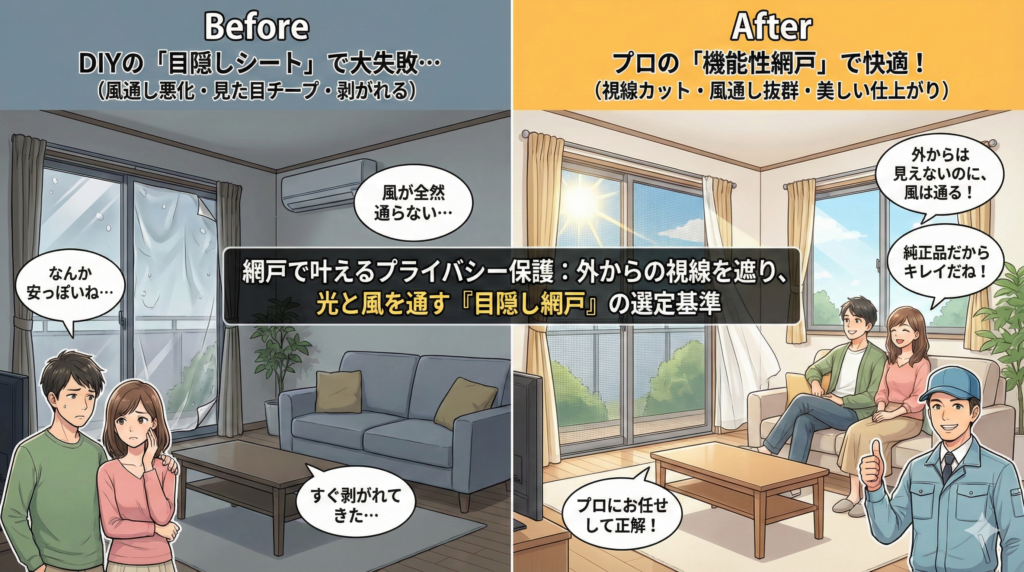 網戸で叶えるプライバシー保護:外からの視線を遮り、光と風を通す『目隠し網戸』の選定基準