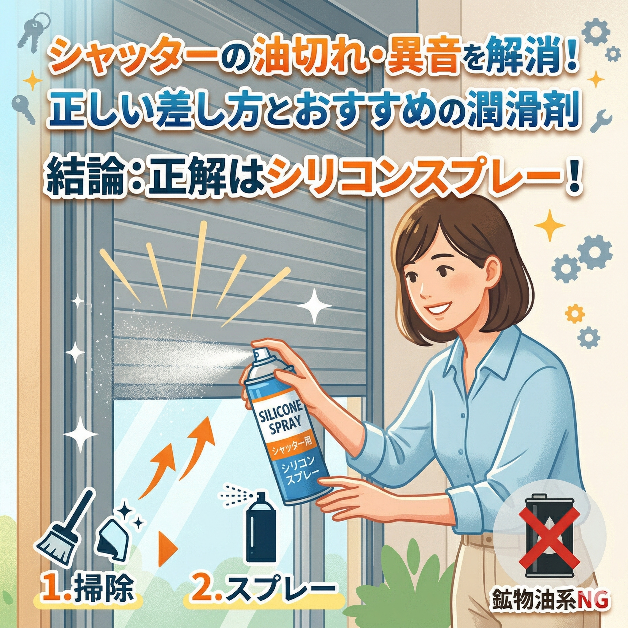 シャッターのメンテナンスは「掃除」と「シリコンスプレーの塗布」の2ステップです。内部機構には絶対に触れないよう注意しましょう。