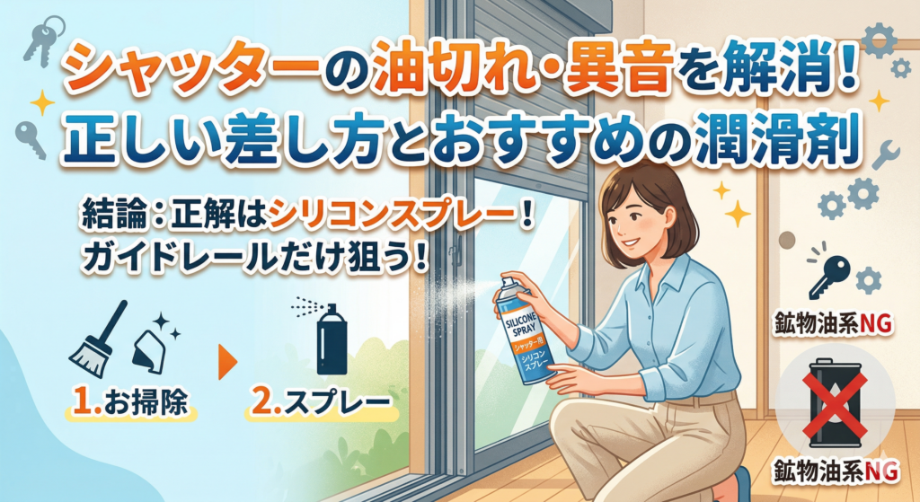 シャッターの動きが重い、または異音がする場合、鉱物油系の潤滑剤は避け、必ず「シリコンスプレー」を使用してください。注油箇所は両サイドのガイドレールのみに留めるのが正解です。