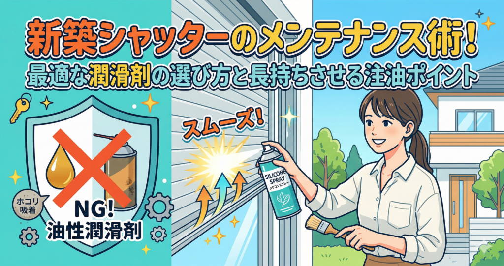シャッターのメンテナンスには、ホコリを吸着しやすい油性潤滑剤の使用を避け、サラッとした「シリコンスプレー」を使用するのが正解です。定期的な清掃と適切な注油により、新築時の軽快な動作を長く保つことができます。