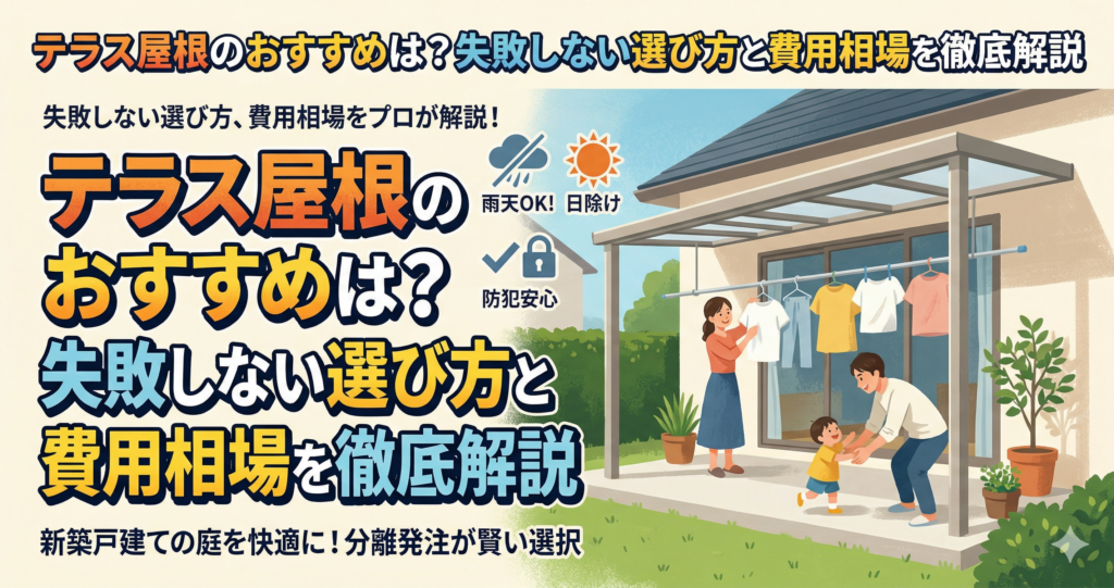 新築戸建てにテラス屋根を設置する際、「ハウスメーカーの見積もりが高い」「種類が多すぎてどれを選べばいいかわからない」と悩んでいませんか?結論からお伝えすると、用途に合わせたサイズ・機能選びと、専門業者への「分離発注」によるコスト削減が、後悔しないテラス屋根選びの最大のポイントです。