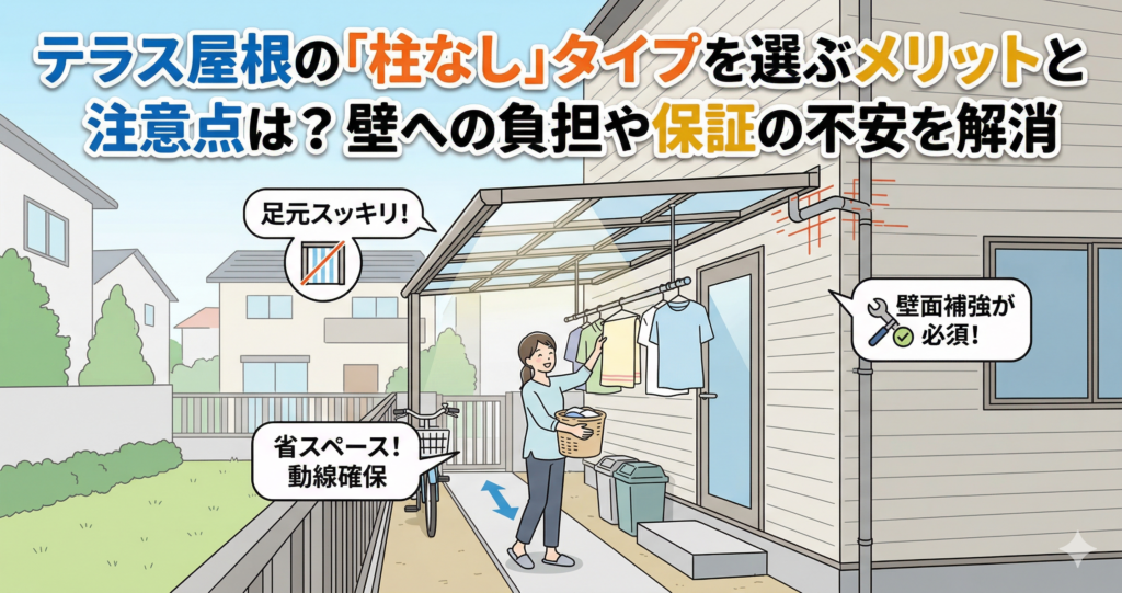 結論からお伝えすると、柱なしタイプは省スペースで動線を妨げない大きなメリットがある一方で、外壁に直接固定して屋根を支える構造上、適切な壁面補強とハウスメーカーへの事前確認が不可欠です。