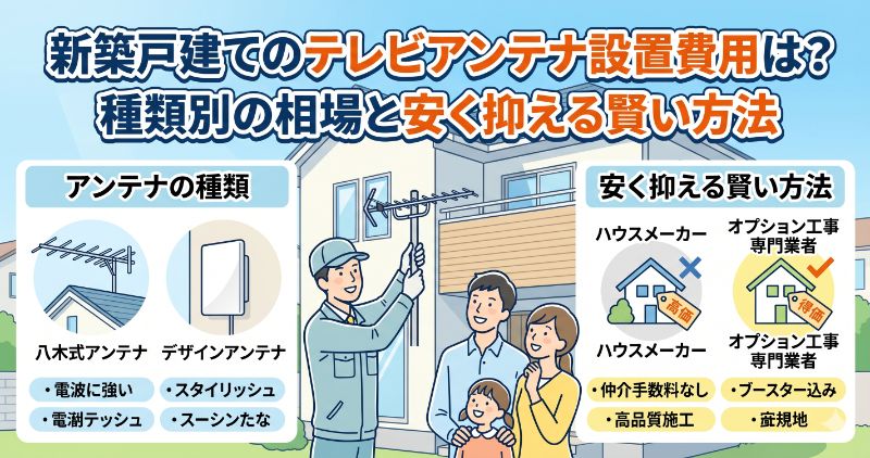 新築戸建てへの入居にあたり、「テレビアンテナの設置費用を少しでも安く抑えたい」とお考えではありませんか?ハウスメーカーから提示された見積もりが予想以上に高額で、驚かれる方は少なくありません。