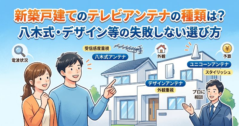 新築戸建てで主に選ばれるアンテナは、受信感度に優れた「八木式アンテナ」、外観を損なわない「デザインアンテナ」、そして近年登場した「ユニコーンアンテナ」の3種類が主流です。