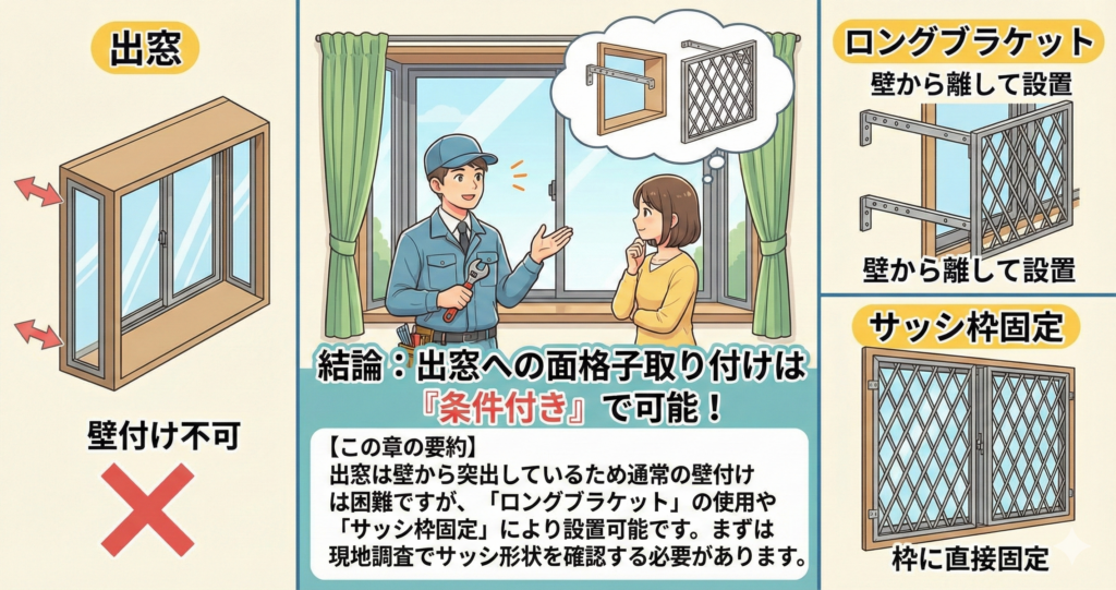 「壁から飛び出している出窓に、普通の面格子は取り付けられるの?」